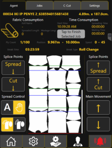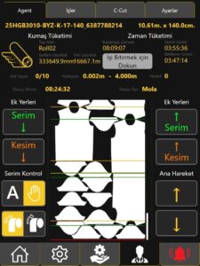 Geleneksel serim iş akışlarında, bir hata görüldüğünde operatörün pastal içindeki birleştirme ve bindirmeleri manuel olarak durdurup yönetmesi gerekir. Bu noktada hatanın pastal içindeki sayısal konumu bilinmez; dolayısıyla hatanın daha sonra kesilip dikilecek bir kalıp alanına mı yoksa kenar/atık (selvedge) bölgesine mi denk geldiği belirsizdir. Bu nedenle her hata fark edildiğinde süreç durur. Bu durum gereksiz duruşlara ve üretim gecikmelerine yol açar. C-CUT ile:- Bir hata bir kalıp alanına denk geliyorsa, operatör bunu anında görür ve Agent’ın birleştirme (splice) yeteneklerini kullanarak uygun bindirme ayarlamasını yapar. Ekranda birkaç dokunuş yeterlidir.